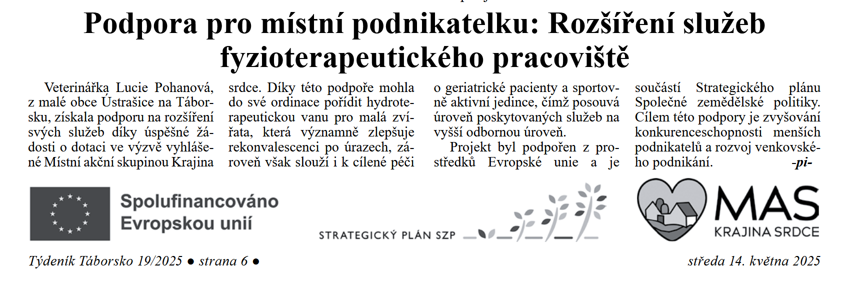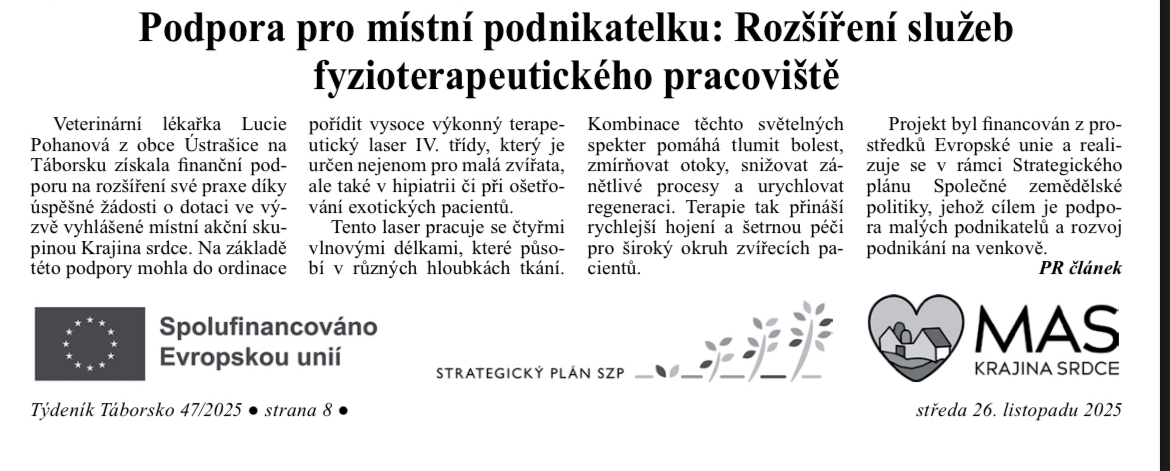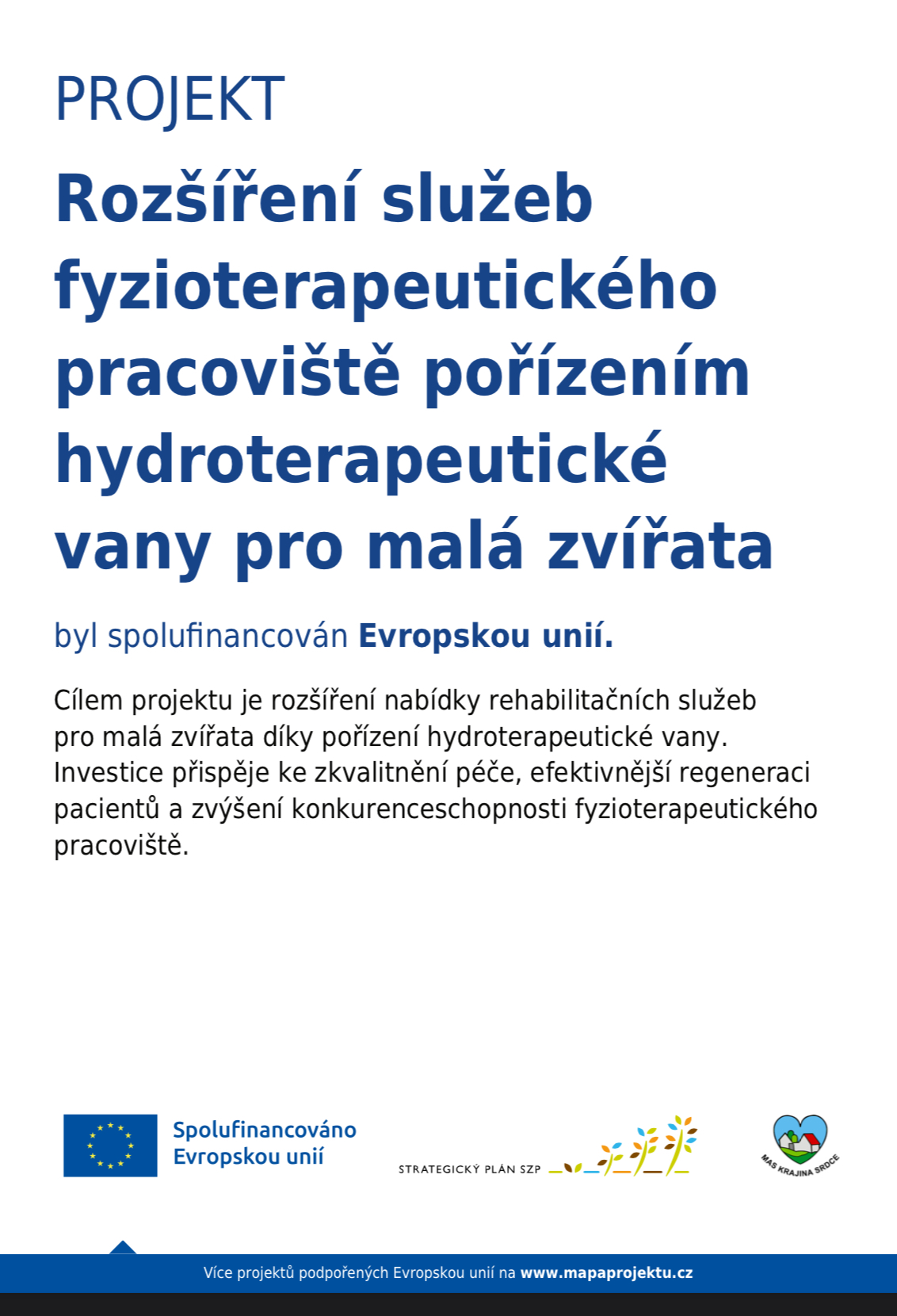 Naše fyzioterapeutické pracoviště nově nabízí hydroterapii pro malá zvířata díky pořízení moderní hydroterapeutické vany. Tento projekt byl spolufinancován Evropskou unií prostřednictvím Strategického plánu SZP na období 2023-2027 a jeho cílem je zkvalitnit péči, urychlit regeneraci pacientů a rozšířit možnosti rehabilitace. Díky této podpoře můžeme poskytovat ještě efektivnější a šetrnější terapii pro naše zvířecí parťáky!