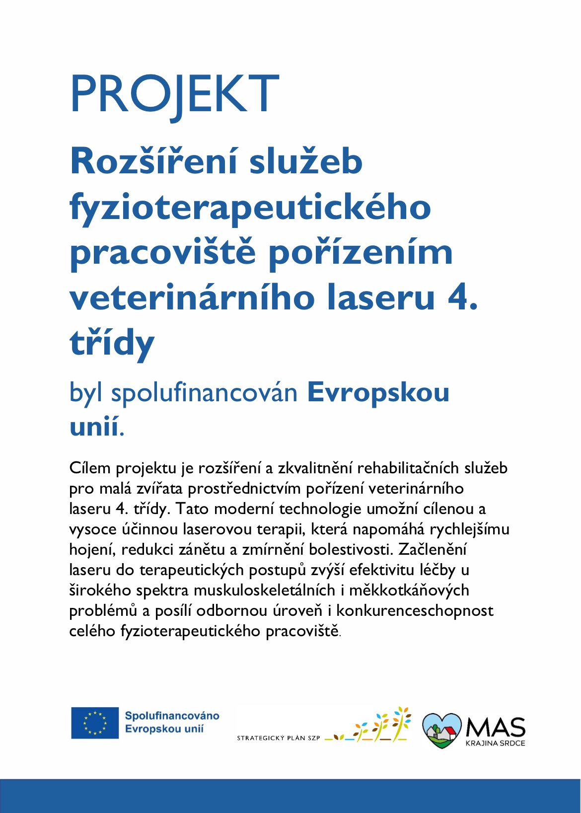 Technologie byla spolufinancována Evropskou unií v rámci Strategického plánu SZP 2023–2027 — díky tomu můžeme poskytovat péči na úrovni špičkových rehabilitačních center a dopřát našim zvířecím parťákům to nejlepší, co současná fyzioterapie nabízí.